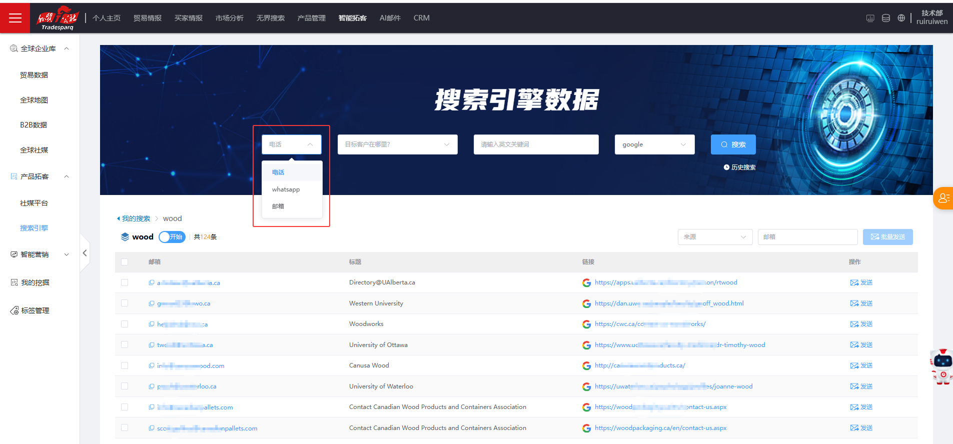 2. “搜索引擎 ”支持在主流搜索引擎“Google ”上通过产品信息获得电话、WhatsApp 或邮 箱信息,节约了客户通过搜索引擎找客户的时间。如下图所示: