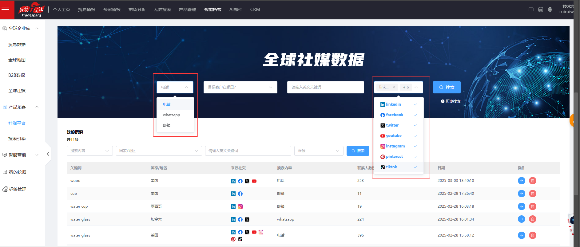 1. “社媒平台 ”支持在 7大国际主流社交媒体上按照产品关键词获得电话、WhatsApp 或邮箱信息,为用户提供便捷、高效和广泛的信息拓客途径。社媒平台支持单一选择或者多个选 择同时搜索。如下图所示:
