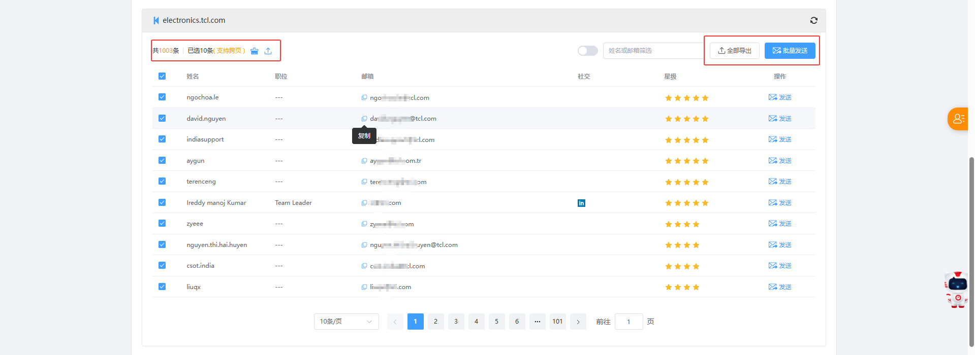 4.支持邮箱快捷复制,支持批量发送或跨页选择发送邮件,如下图所示: