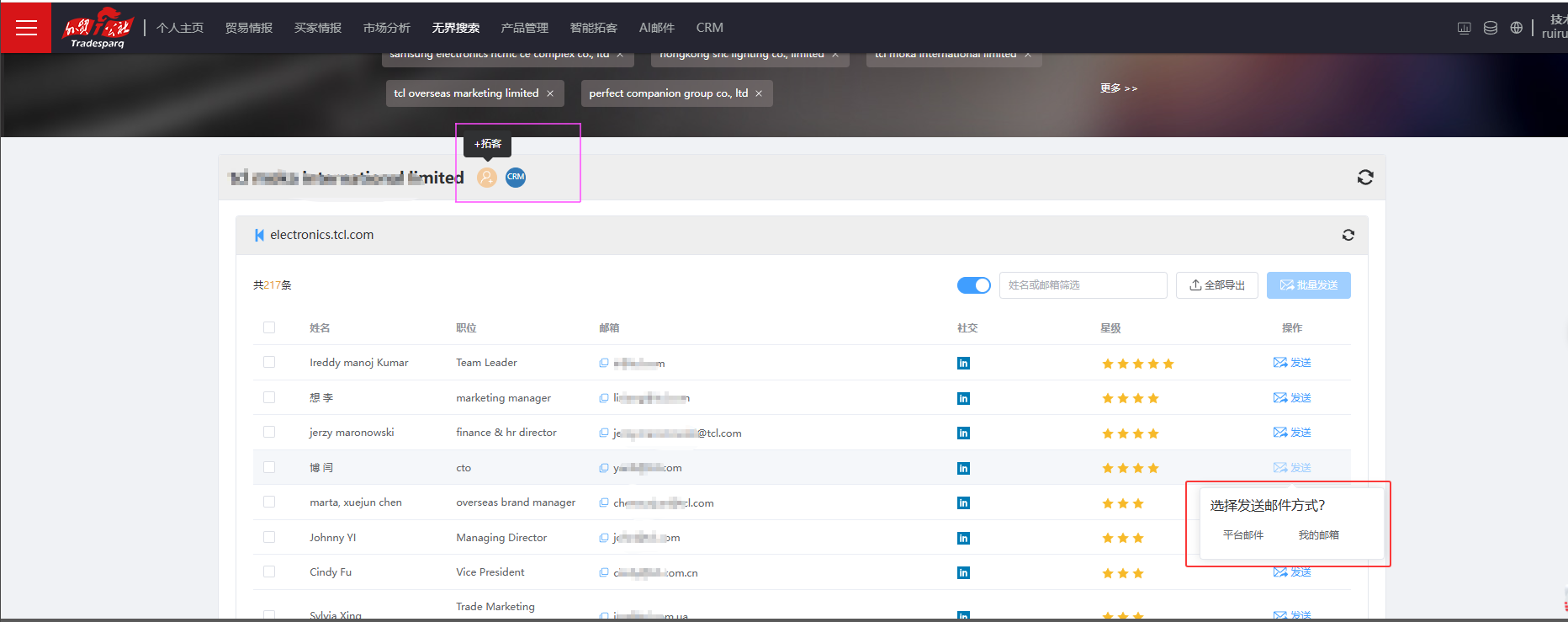 1.无界搜与 AI 邮件打通,支持一键加入“拓客 ”,允许用户选择邮件发送方式, 以及使用 AI 邮件调用模板发送邮件。邮件发送记录和智能拓客邮件记录合并为一个整体,为用户提供更便捷的邮件服务。如下图所示: