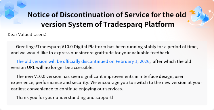 Notice of Discontinuation of Service for the old version System of Tradesparq Platform
